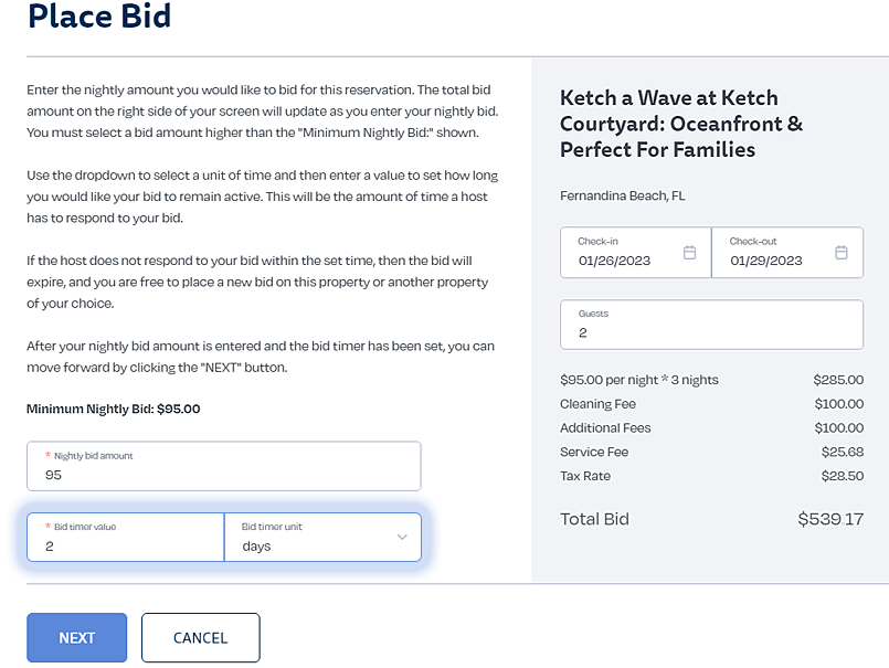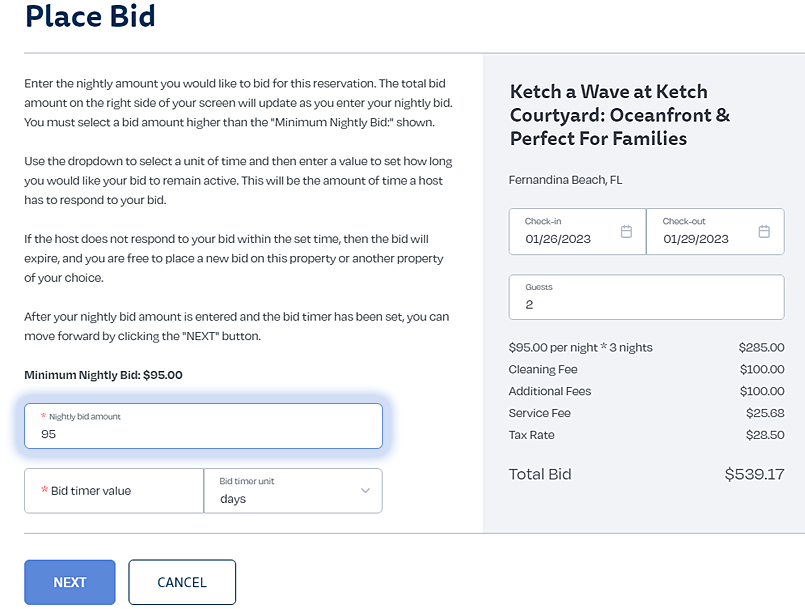 Type the nightly rate you would like to bid into the bidding window. Our system will then calculate what your total bid amount would be for your entire stay.